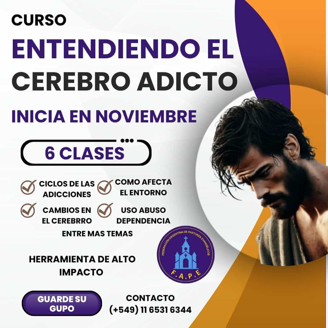 No te pierdas ser parte y tener en tu poder una Herramienta de Alto Impacto. Verás tema como 📌Ciclos de las Adicciones. Como afecta en entorno. 📌Cambios en el Cerebro. 📌Uso Abuso y dependencia, entre otros temas. 📅 INICIA en Noviembre 2025. Duración 6 Clases. ℹ️ Invita: FAPE Federación Argentina de Pastores Evangélicos. 👉 Informes: + 54 9 11 6531-6344 | facebook.com/federacionargentinadepastoresevangelicos
