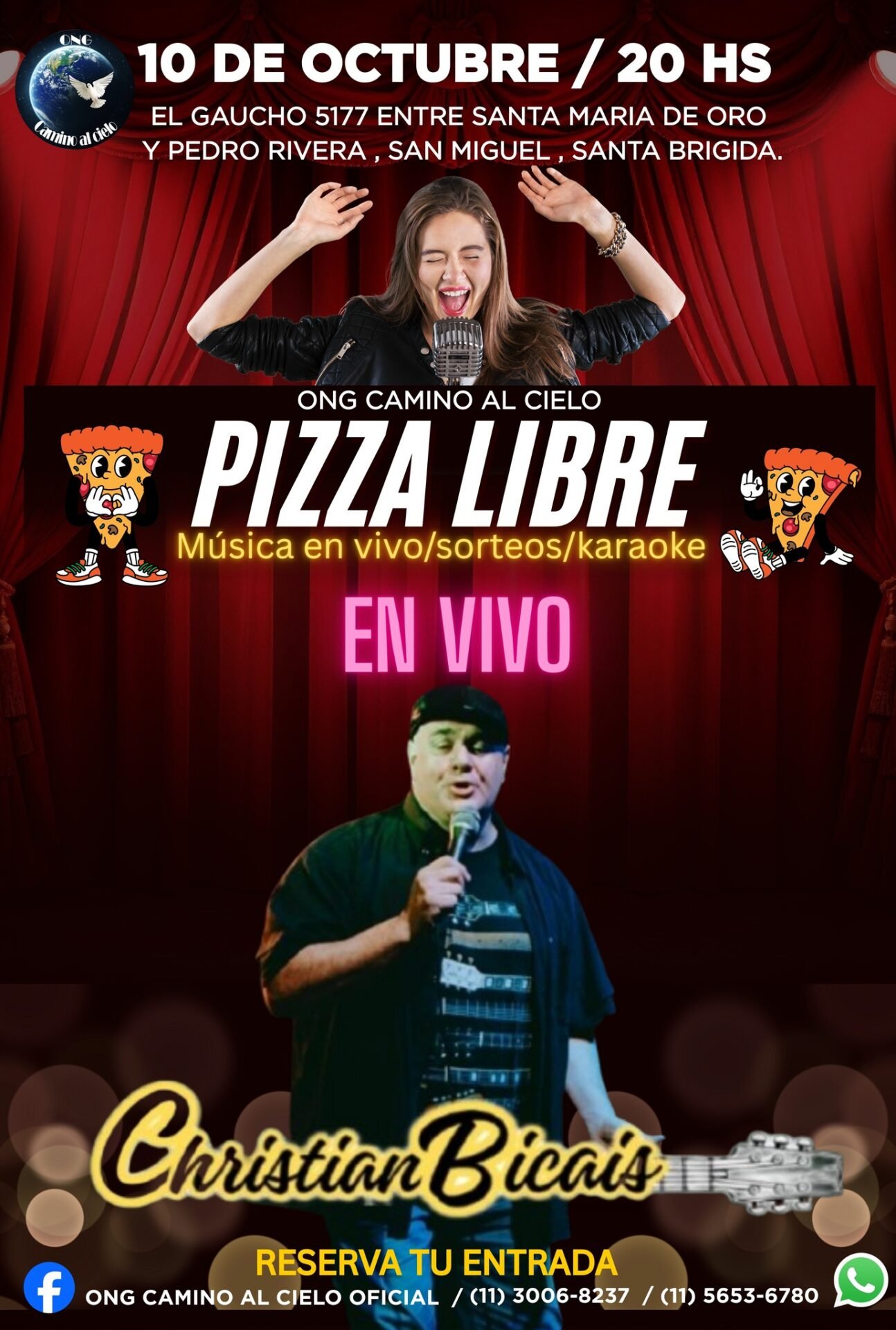 ℹ️ Con la presentación de Cristian Bicais. Música en Vivo, Sorteos y Karaoke. Te esperamos veni a compartir con tu familia de las mejores pizzas, musica en vivo y atencion de la ONG. 📌 En El Gaucho 5177 entre Santa Maria de oro y Pedro Rivera, San Miguel, Bs. As. 📝 Reserva tu entrada: +54 9 11 3006-8237 | + 54 9 11 5653-6780 | facebook.com/Ongcaminoalcielooficial | facebook.com/Ministeriocaminoalcielooficial
