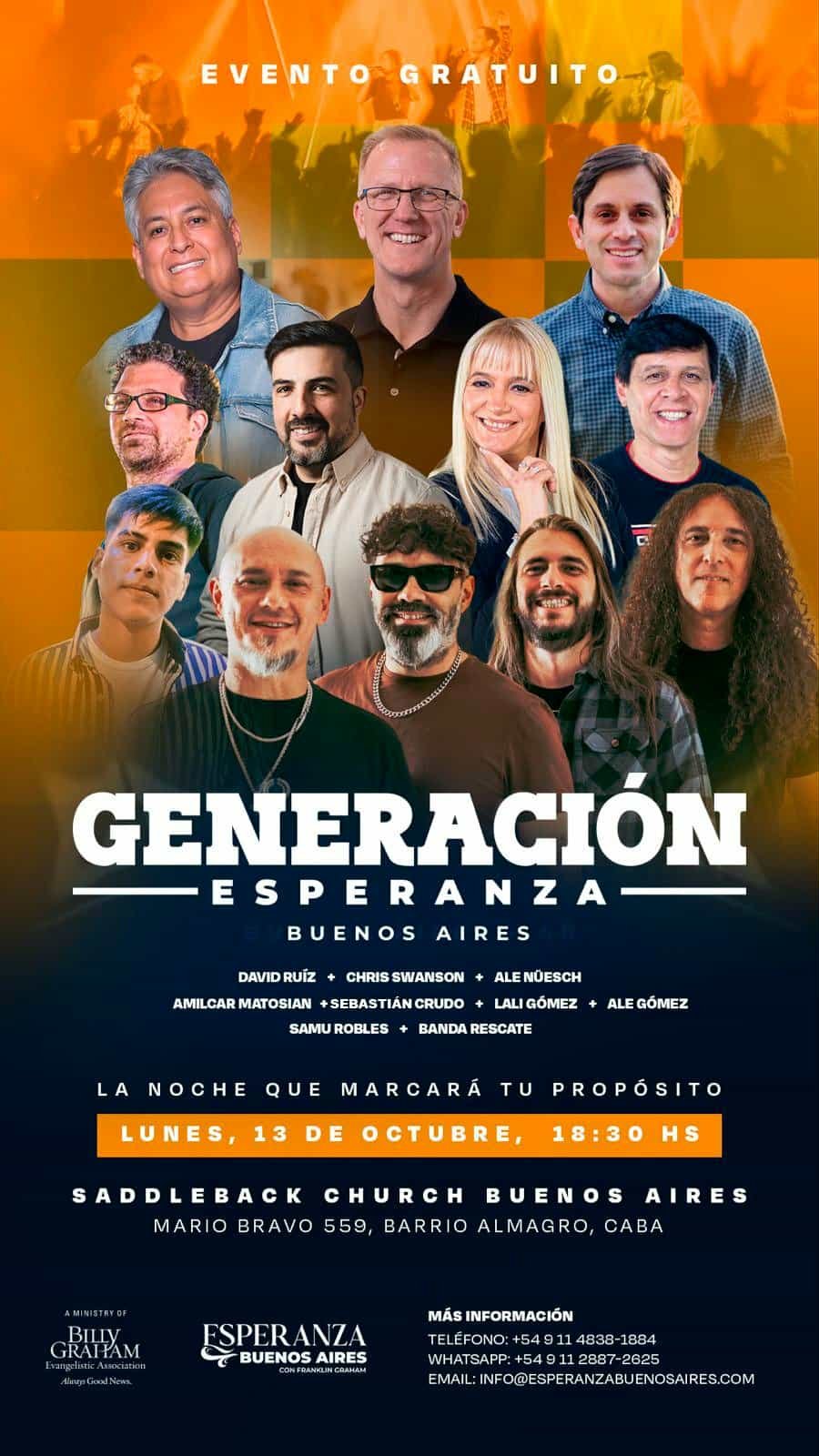 🔥✨ ¡Llega la Conferencia para jóvenes y adolescentes, como parte del movimiento Esperanza Buenos Aires 2025 de la Asociación Evangelística Billy Graham! 🌎 Este encuentro tiene como objetivo motivar, preparar e inspirar a las nuevas generaciones al evangelismo y ser una influencia positiva y de bendición en la sociedad, promoviendo valores de esperanza, fe y compromiso social. Con la participación de DAVID RUÍZ, CHRIS SWANSON, ALE NUESCH, AMILCAR MATOSIAN, SEBASTIÁN CRUDO, LALI GÓMEZ, ALE GÓMEZ, SAMU ROBLES y la Banda RESCATE 🙏 Es libre y gratuito, pero con inscripción previa. 🔴 En el Auditorio Saddleback. 📌 Mario Bravo 559, Almagro, CABA. ⏰ A las 18:30hs. INSCRIPCIÓN: Confirmá tu participación enviando la cantidad de personas que participarán de tu congregación a siguiente número de Whatsaap: +54 9 11 2887-2625 📲