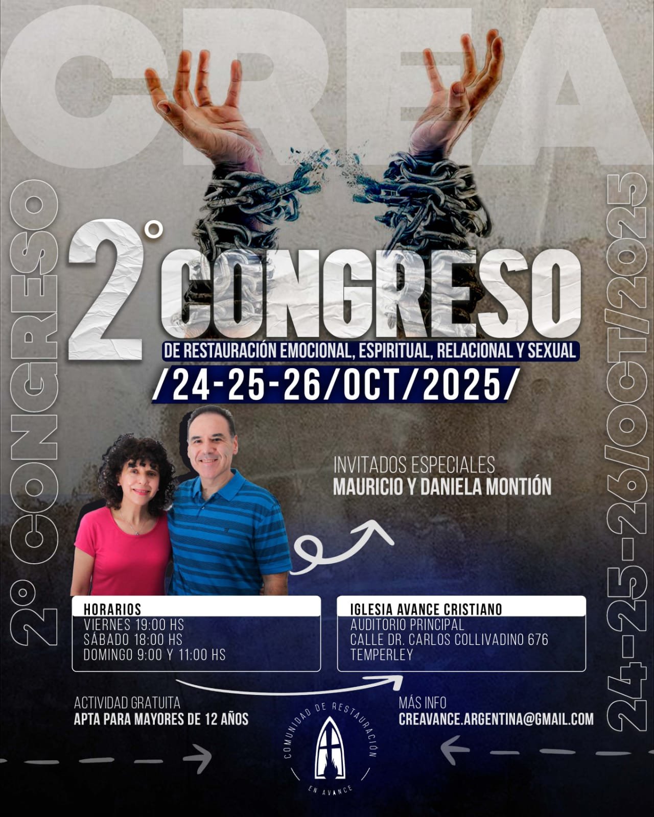 ℹ️ Invitados Especiales: Mauricio y Daniela Montión. 🔴 En el Auditorio de la Iglesia Avance Cristiano. 📌 Dr. Carlos Collivadino 676, Termperley, Bs., As. 🕒 Horarios Viernes 19hs. | Sábado 18hs. | Domingo 9 y 11hs. Entrad a Libre y Gratuita. 👉 Informes: creavance.argentina@gmail.com | instagram.com | facebook.com/avancecristiano