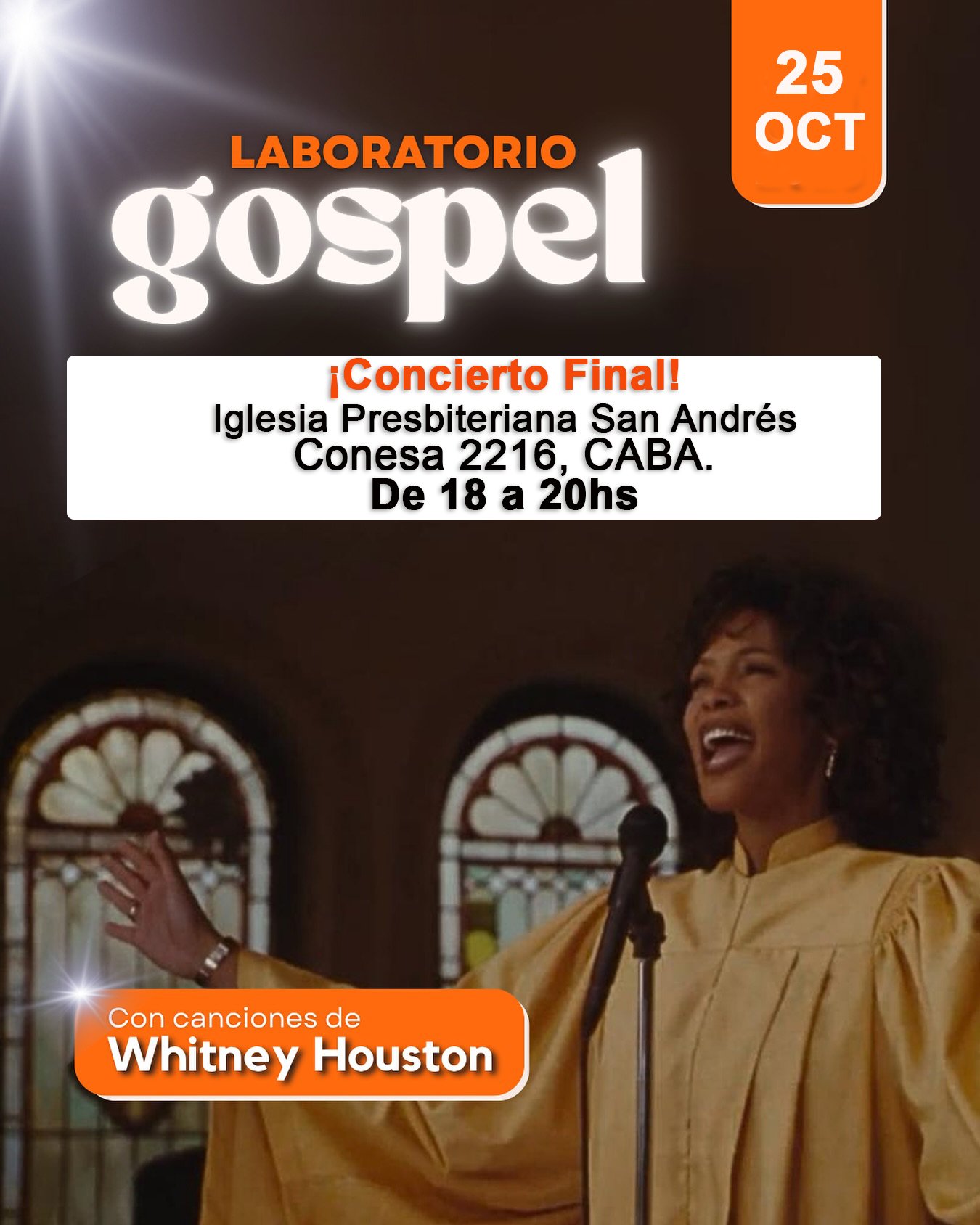 Show en Vivo a cargo del Coro Gospel creado por el Laboratorio Gospel basado en el repertorio gospel de la famosa cantante Whitney Houston. ¡Vení a disfrutar este show sin igual! 🔴 En la Iglesia Presbiteriana San Andrés, Belgrano. 📌 Conesa 2216, esquina Mendoza, CABA. 🕒 De 18 a 20hs. 📝 Tickets Disponibles a $11.000. 👉 COMPRÁ desde AQUÍ +54 9 11 2834-4065 Gospel en Argentina. instagram.com/gospelenargentina | facebook.com/gospelenargentina
