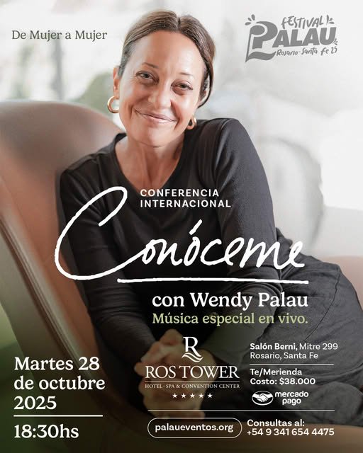 Una merienda especial”. ℹ️ Wendy Palau es una reconocida conferencista internacional que inspira y empodera a mujeres de diferentes realidades y culturas. Con la participación musical de Manuel Wirzt, Germán Barceló y Marisol Park, Costo: $38,000. *Queremos aclarar que el valor de la entrada corresponde únicamente a la merienda. Tanto la conferencia como las participaciones musicales del evento son totalmente gratuitas. 🔴 En Salón Berni – Hotel Ros Tower. 📌 Mitre 299, Rosario, Prov. de Santa Fe, Argentina. 🕒 A las 18:30hs. 👉 Consultas al: +54 9 341 654 4475 | palaueventos.org