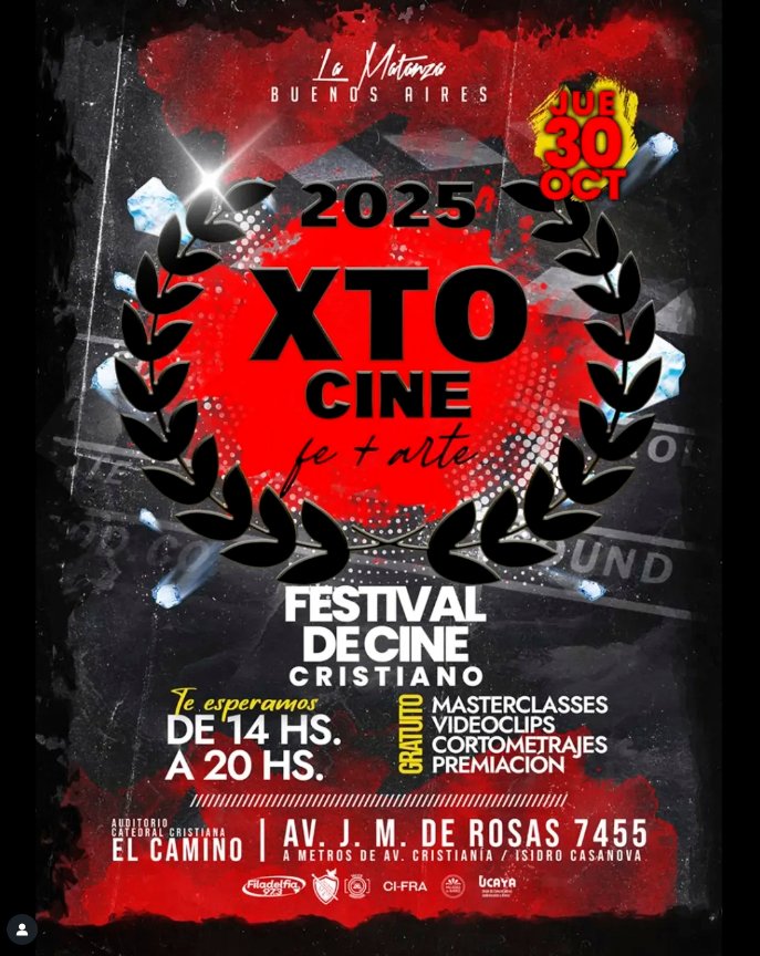 Con el objetivo de difundir valores, promover el talento y compartir historias que inspiran, llega a La Matanza XTO CINE, el primer festival de cortometrajes cristianos de la zona oeste. 🏆 Una experiencia única para inspirarte, emocionarte y busca reunir a la comunidad en torno al arte audiovisual y la espiritualidad, en un espacio de reflexión, aprendizaje y celebración. 🎥✝️ ✅ Masterclasses + proyección de videoclips y cortometrajes + premiación 🏆🔴 En el Auditorio Catedral Cristiana El Camino. 📌 Av. J. M. de Rosas 7455, Isidro Casanova, Bs. As. 🕒 De 14 a 20hs. 🔹 Entrada GRATUITA. Informes: 👉 instagram.com/xtocine