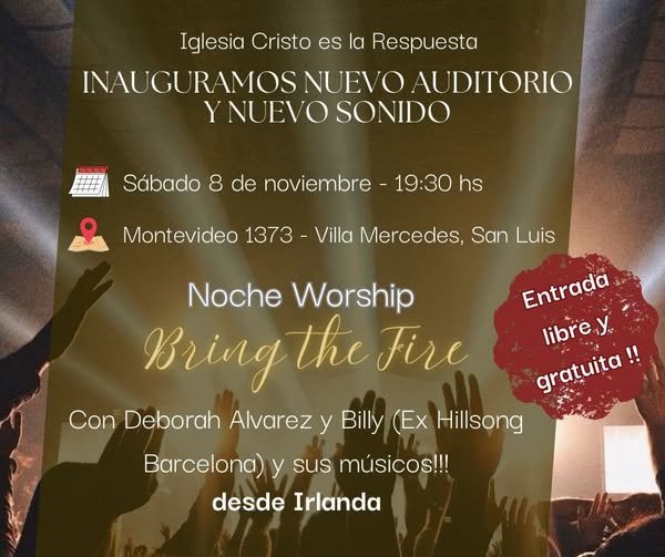 Villa Mercedes y país NO te pierdas ésta Fiesta.INAUGURAMOS NUEVO AUDITORIO Y SONIDO, ℹ️ Con la presentación de Deborah Álvarez y Billy (Ex Hillsong Barcelona) y sus músicos desde Irlanda. 🔴 En la Iglesia Cristo es la Respuesta. 📌 Montevideo 1373, Villa Mercedes, Prov. de San Luis, Argentina. 🙌😄