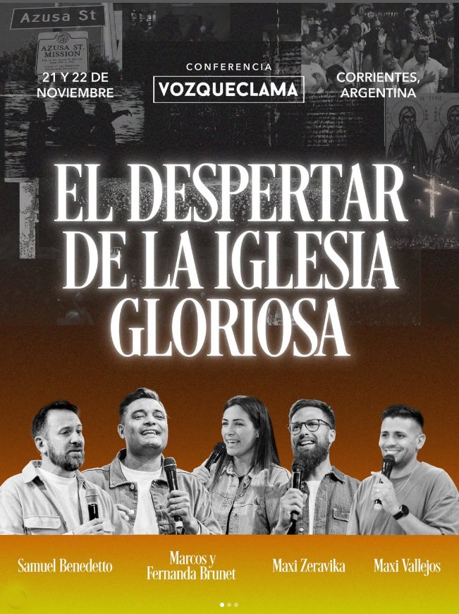 🥖🙏🏻 🙌 Nos reuniremos como cuerpo de Cristo para ministrar juntos al Señor y escudriñar las escrituras. Con humildad, queremos observar nuestra historia como Iglesia, discernir los desvíos por las intervenciones humanas, también conocer los avivamientos y reconocer cómo Dios ha preservado un remanente fiel a lo largo de los siglos. ℹ️ Con la presencia de Marcos y Fernanda Brunet, Samuel Benedetto, Maxi Zeravika y Maxi Vallejos. 🔴En el Salón de Conferencias "LoLa Eventos", Corrientes, Argentina. 📌 En Corrientes, Capital. 📨 Invita/ Voz que Clama Iglesia. 🌐 Ingresa al siguiente link para adquirir tu entrada: 👉🏻 https://etickets.com.ar/conferencia-voz-que-clama/ 👉 Informes: WhatsApp: +54 9 379 4046620 | vozqueclamaiglesia@gmail.com | instagram.com/vozqueclama.iglesia