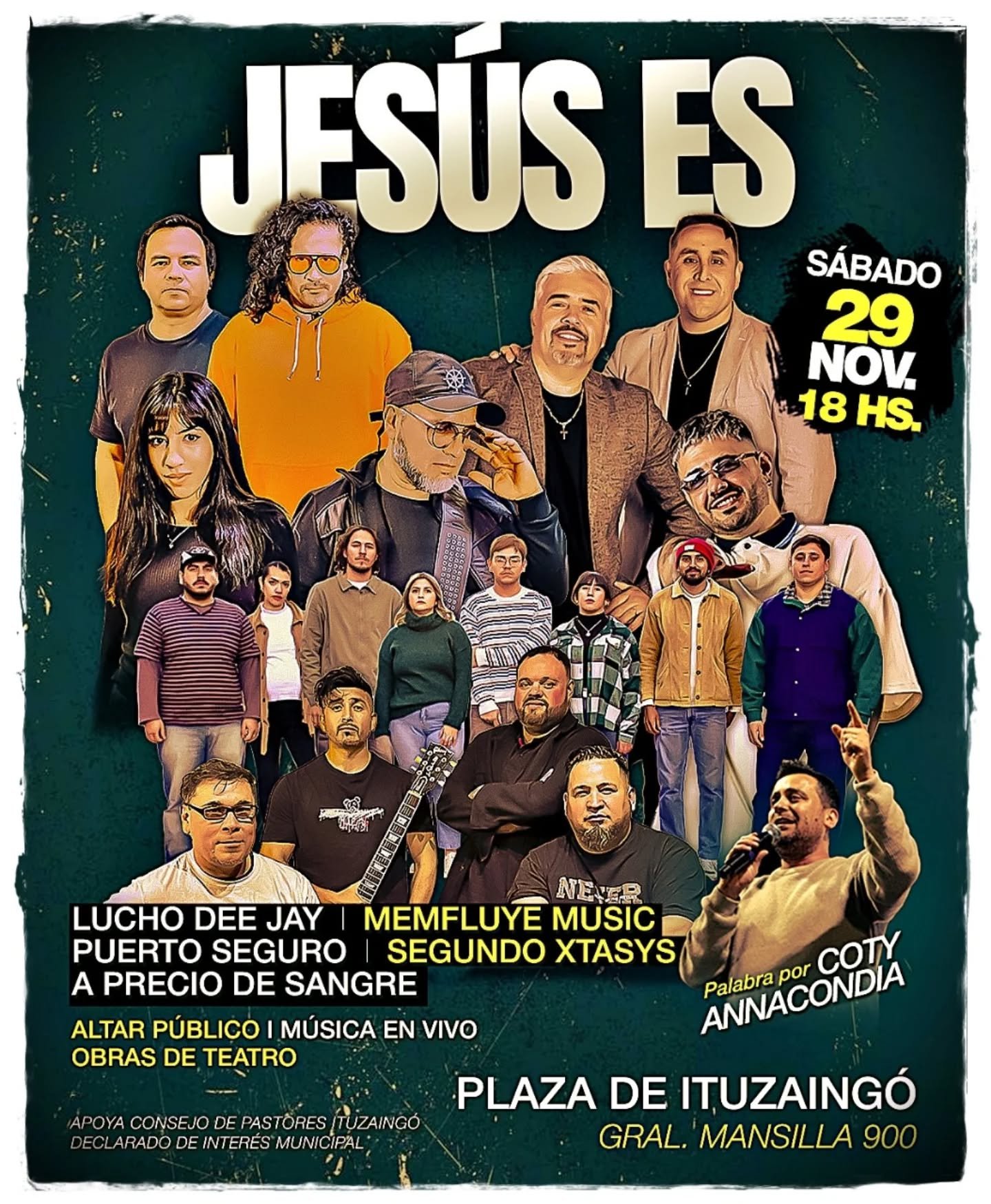 . Con la Palabra de COTY ANNACONDIA. Y la música de LUCHO DEE JAY, PUERTO SEGURO, A PRECIO DE SANGRE, SEGUNDO XTASYS, MEMFLUYE MUSIC. Altar Público, Música en Vivo, Obras de Teatro. Vamos a vivir una Experiencia Unica en la Presencia del Señor, Veni al Altar que vamos a levantar en la plaza junto a todo el pueblo de Dios, Ituzaingo y todo Zona Oeste se levanta en el nombre de Dios! vamos a llevar el mensaje a los que no conocen a Jesus. 🙌 ¡Un festival increíble pensado para toda la familia! 📌 En La Plaza 20 de Febrero. Gral Mansilla 900, Ituzaingo, Bs. As. A partir de la 18hs. 🎫 ENTRADA LIBRE. 👪 Veni con tus amigos a disfrutar un momento unico en la Presencia De Dios 👐 😲 ¡NO TE LO PODES PERDER! facebook.com/jesusesmusicfest