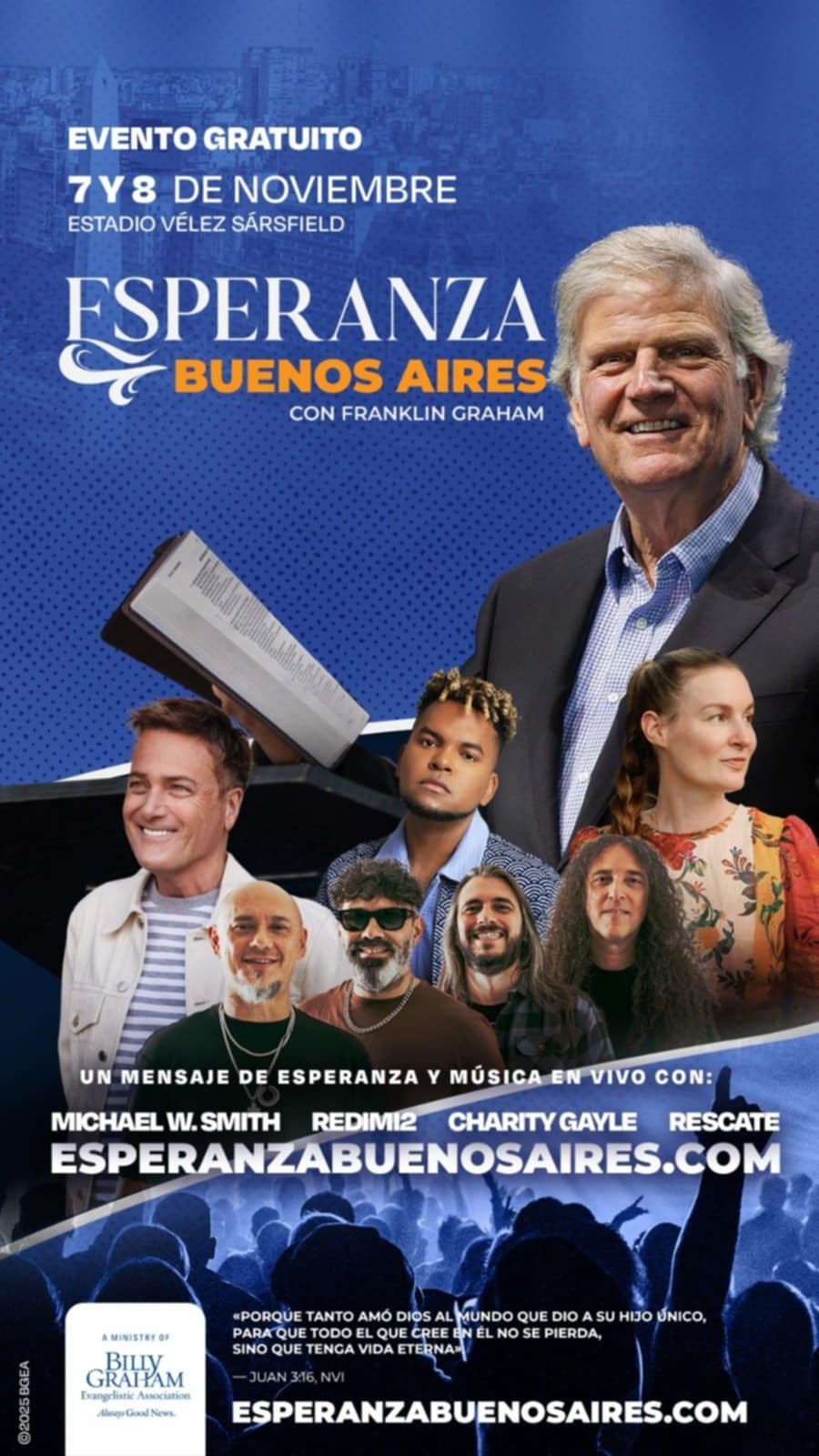 Esperanza Buenos llega a la Ciudad Autónoma de Buenos Aires. ℹ️ El evento incluirá mensajes de esperanza impartidos por Franklin Graham y conciertos gratuitos con artistas cristianos reconocidos, entre los cuales se destaca la participación de Rescate, Redimi2, Charity Gayle y Michael W. Smith. Se espera que asistan personas de la ciudad y de la región circundante, con el objetivo de compartir el mensaje del Evangelio. 🔴 En el Estadio Vélez. 📌 CABA. ℹ️ Con entrada libre y gratuita. 👉 Informes: https://pages.billygraham.org/buenos-aires/?dr=esperanzabuenosaires.com