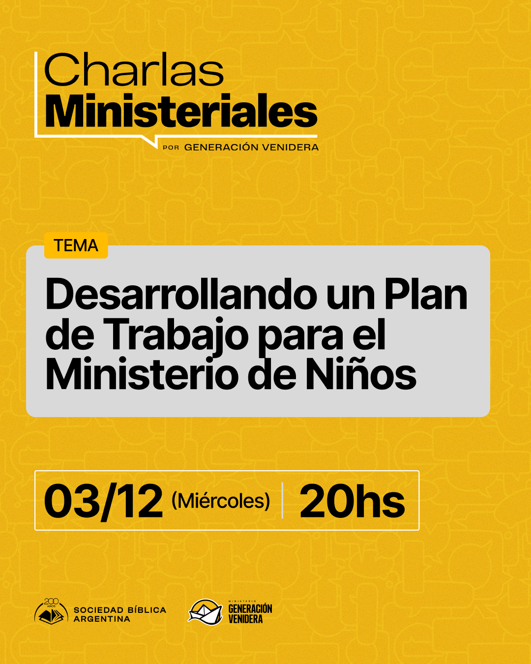 ℹ️ Sociedad Bíblica Argentina, a través de su ministerio Generación Venidera, te invita a participar de la charla ministerial “Desarrollando un plan de trabajo para el ministerio de niños”, un encuentro que ofreceremos junto al ministerio OneHope. Un espacio cercano y formativo para quienes sirven en la enseñanza de la Palabra a las nuevas generaciones. Son momentos de intercambio y aprendizaje donde compartimos principios y herramientas que puedan fortalecer el trabajo cotidiano en la iglesia. 💻 Modalidad: en línea y gratuita. 🕗 20hs (Argentina). Con inscripción previa. 👉 info@biblica.org | instagram.com/SociedadBiblicaArgentina | sba.org.ar