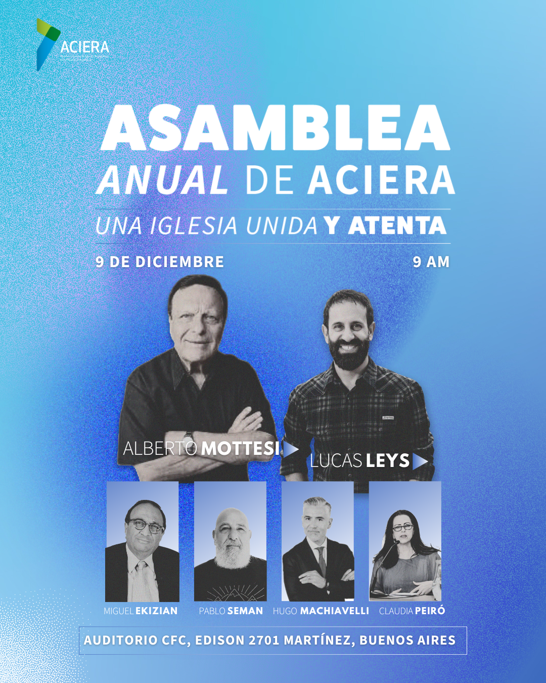 Alianza Cristiana de Iglesias Evangélicas de la República Argentina. Bajo el lema ‘Una iglesia unida y atenta’ será un tiempo especial para reflexionar juntos sobre los desafíos que enfrenta la Iglesia en nuestro país. ℹ️ Serán expositores en esta Asamblea que iniciará con un tiempo devocional con la participación del pastor Alberto Mottesi, reconocido conferencista internacional y escritor en hispanoamérica. Además serán expositores el pastor Lucas Leys, fundador y visionario del ministerio Especialidades 625; el pastor Miguel Ekizian, también médico psiquiatra y psicoterapeuta; el sociólogo, antropólogo e investigador del CONICET, Pablo Seman; el periodista y licenciado en Ciencias de la Comunicación, Hugo Macchiavelli, y la Licenciada en Historia y periodista, Claudia Peiró. 🔴 En el Auditorio del Centro Familiar Cristiano. 📌 Edison 2701, Martínez, Bs. As. ⏰ 9:00hs. 🎟️ Con Inscripción previa. 👉 Informes: ACIERA.org | facebook.com/aciera.arg | canalluz.org