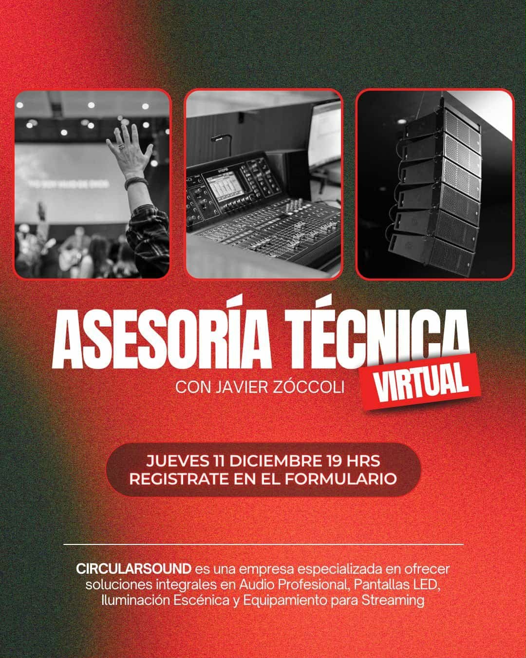 ℹ️ Para actualizar tu audio, pantallas LED, iluminación o necesitás optimizar tu espacio de streaming, En esta sesión, guiada por Javier Zoccoli, vas a entender de manera clara y sencilla qué equipos te convienen para empezar, cómo alcanzar un nivel profesional, qué pantallas LED pueden potenciar tu espacio y cómo lograr un streaming estable y sin fallas. ⏰ A las 19hs vía MEET para brindarte asesoramiento sobre el equipamiento ideal y potenciar tu proyecto con soluciones profesionales y prácticas. 🎟️ Para participar, solo tenés que completar el siguiente formulario es totalmente gratuito. https://forms.gle/269d1dicpj1dqBk79. 👉 Informes:https://circularsound.com