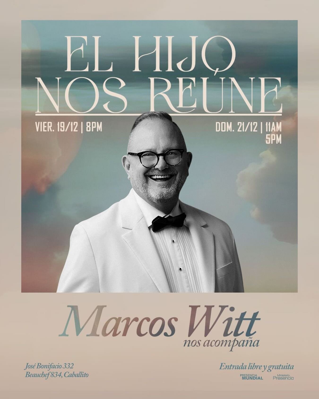 ℹ️ Marcos Witt nos acompaña para mirar y adorar juntos al que es el Centro. Un encuentro donde Cristo ocupa todo. Te esperamos con tu familia y amigos. Viernes 19 a las 28 PM. | Domingo 21 a las 11AM y 5 PM. 🔴 En el Ministerio Presencia de Dios. 📌 José Bonifacio 332 / Beauchef 834, Caballito, CABA. 🎟️ Entrada libre y gratuita. 👉 Informes: presenciadedios.com | facebook.com/presenciaddios