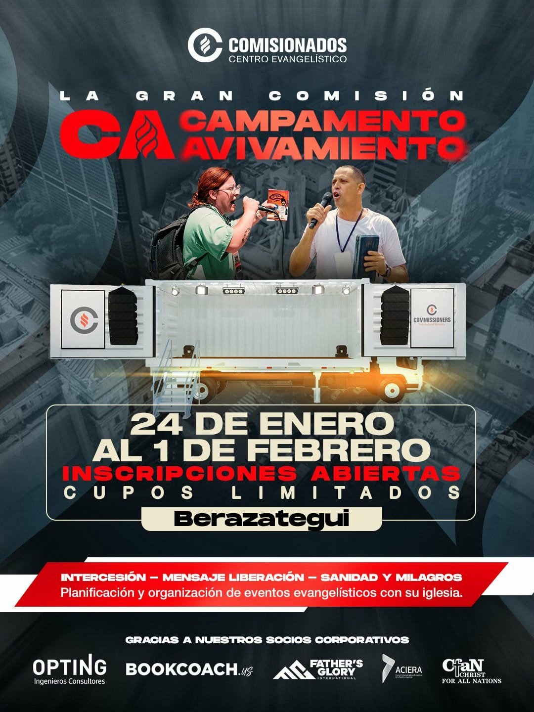 Interseción, Mensaje, Liberación, Sanidad y Milagros. 🔥 ¡Estamos viviendo días gloriosos en el Campamento AVIVAMIENTO! 🔥 Una generación de evangelistas está siendo equipada para movilizar ciudades y expandir el Reino de Dios con valentía. Si Dios te llamó como evangelista, ¡este es tu momento! 🙌 🔴 En Berazategui, Bs. As. Informes: Centro Comisionados Global. ¡Juntos en la cosecha! secretaria@comisionados.org | + 54 9 11 3697-9045 | Calle 21 N 3910, Berazategui, Bs. As. Argentina | https://comisionados.org