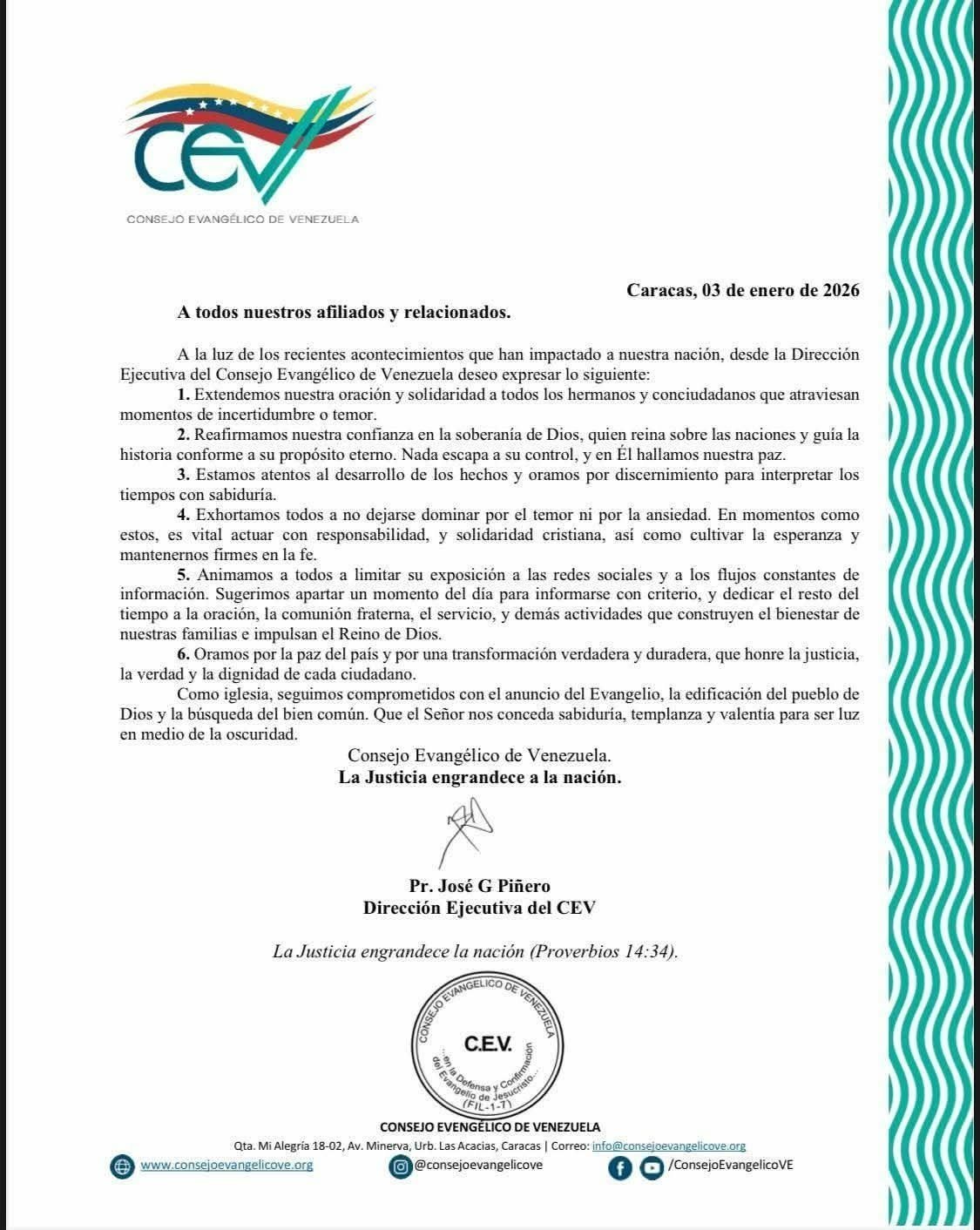 «Extendemos nuestra oración y solidaridad a todos los hermanos y conciudadanos que atraviesan momentos de incertidumbre o temor», declaró el Consejo Evangélico de Venezuela. «Reafirmamos nuestra confianza en la soberanía de Dios, quien reina sobre las naciones y guía la historia según su propósito eterno».