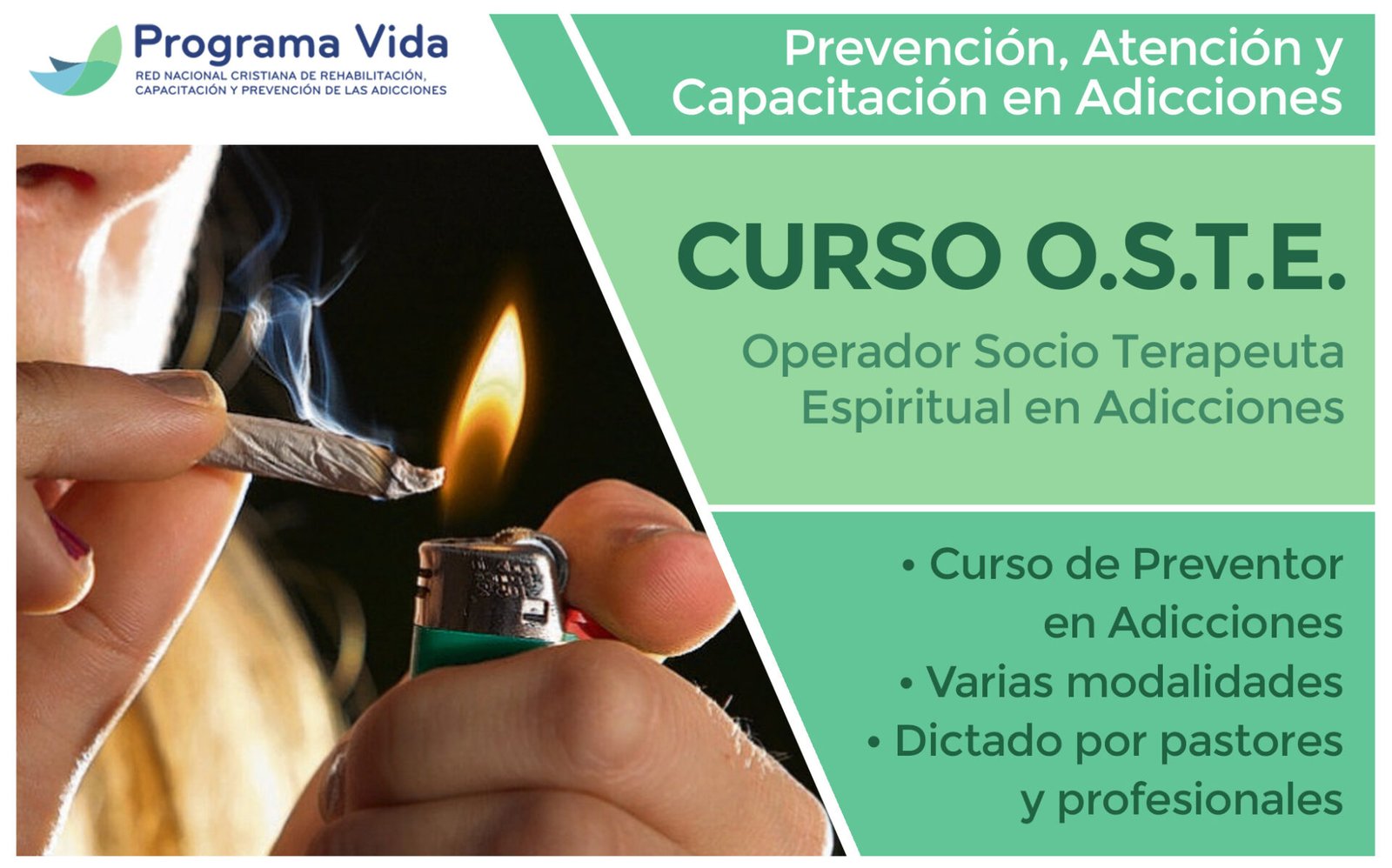 En el año 2008, se crea la Capacitación de Formación en Operador Socio Terapeuta Espiritual en Adicciones (OSTE). Ya hemos preparado cerca de 5.300 operadores que colaboran con sus pastores, asisten a personas con problemas de adicciones en cárceles, escuelas, y clubes.